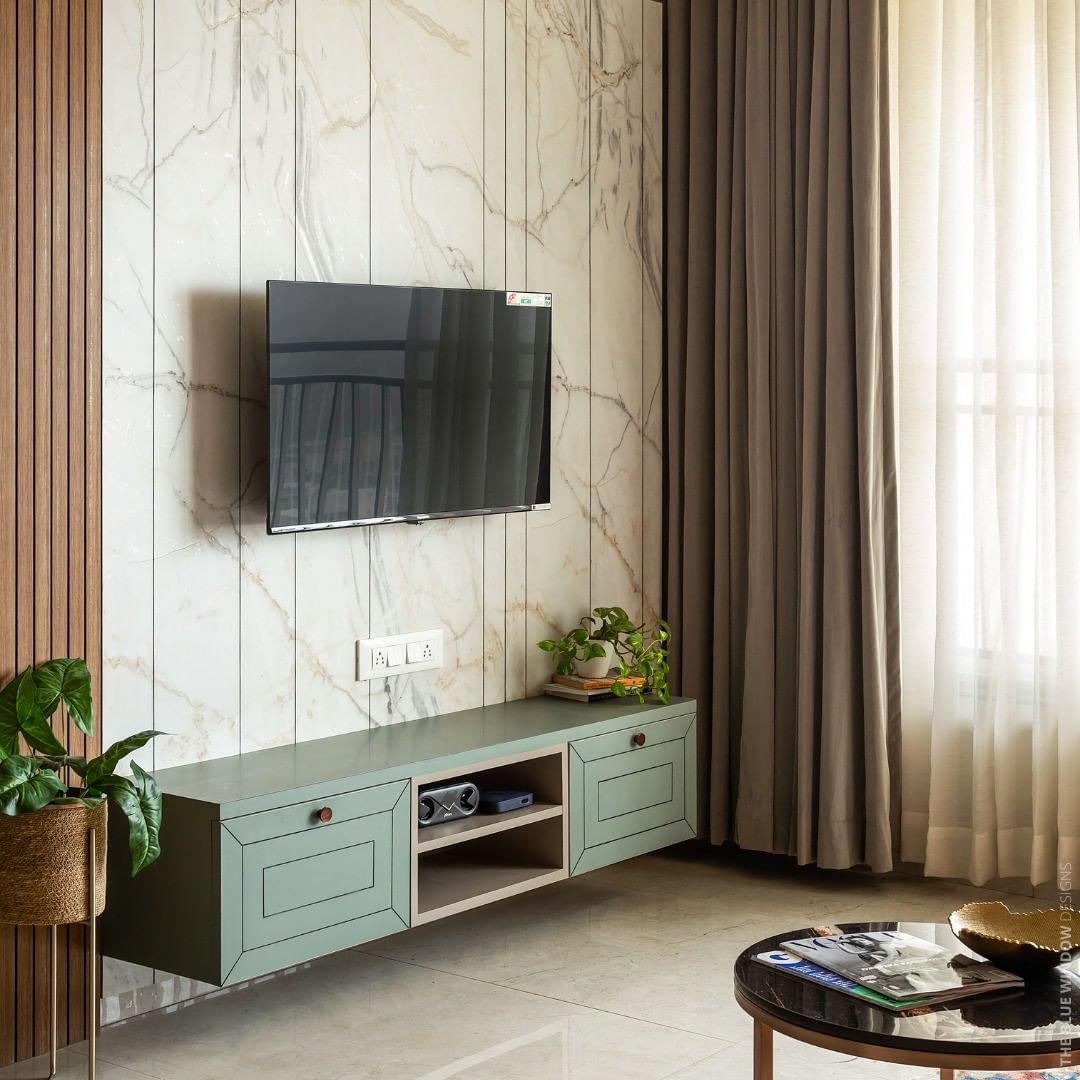 The view from the entrance/main door showcases this beautiful TV Unit and equally well-balanced and merged shoe rack space. The
